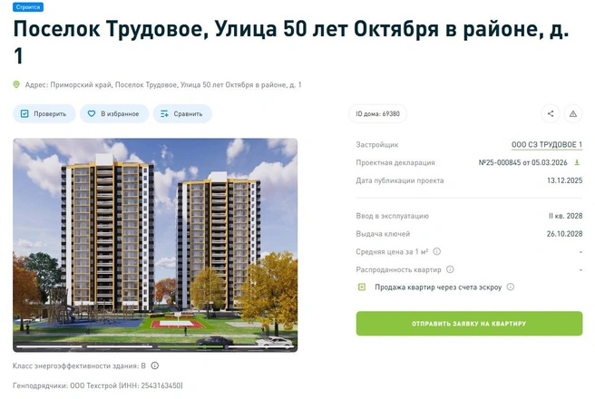 Общество с ограниченной ответственностью "СЗ "Трудовое 1“" действует с декабря 2023 года. Владельцами компании, как напрямую, так и через подконтрольные организации, являются Владислав Демьянчук (49%), Юрий Доманюк (48,96%) и Олеся Миронова (2,04%).