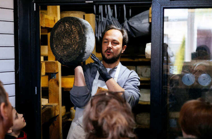 С удовольствием фермер рассказывает о своем деле : «Чем больше камер, тем старше сыр и можно закладывать туда головки, потому что молочный цех может быть размером с комнатку, где стоят прессы и чаны для варки. Но полки для хранения и созревания сыра должны исчисляться километрами, потому что это не сыр, который лежит две недели, это сыр, который лежит очень долго. У нас есть позиция, которая лежит 8 лет. И все это время аффинёр, который ухаживает за этим сыром, два раза в неделю его переворачивает, моет, чистит, купает, как своего ребенка».
